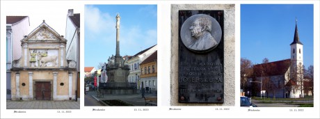 Masné krámy, morový sloup, kostel a a pamětní deska.